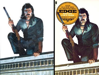 When the possibility that the Edge series would be revived became a certainty we found ourselves facing a major problem - the artwork on the original books had become iconic, particularly the appearance of Edge himself. How could we relaunch the series for the digital age without keeping that classic look? We could of course opt for an entire new look and this was considered for the briefest of moments but when Terry Harknett, the man behind the George Gilman name suggested contacting Tony Masero, the artist responsible for many of the original Edge covers and making him an offer he couldn't refuse - namely, give us a new cover, pretty please! the response was better than expected.
